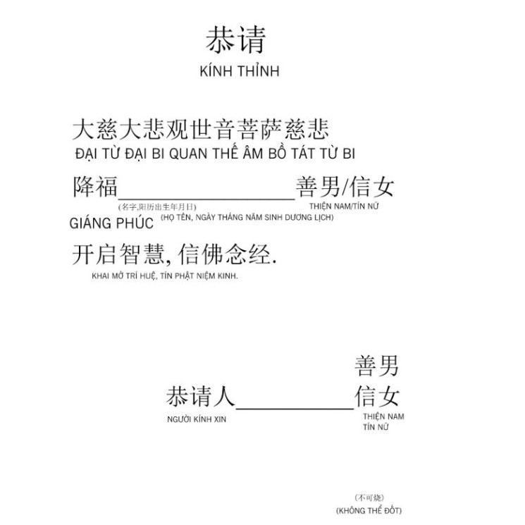 — Dùng bút đen ở ô “Giáng phúc” điền họ tên và ngày tháng năm sinh dương lịch của người nhà, đồng thời điền tên của bản thân vào ô “Người kính thỉnh” ở phần kí tên